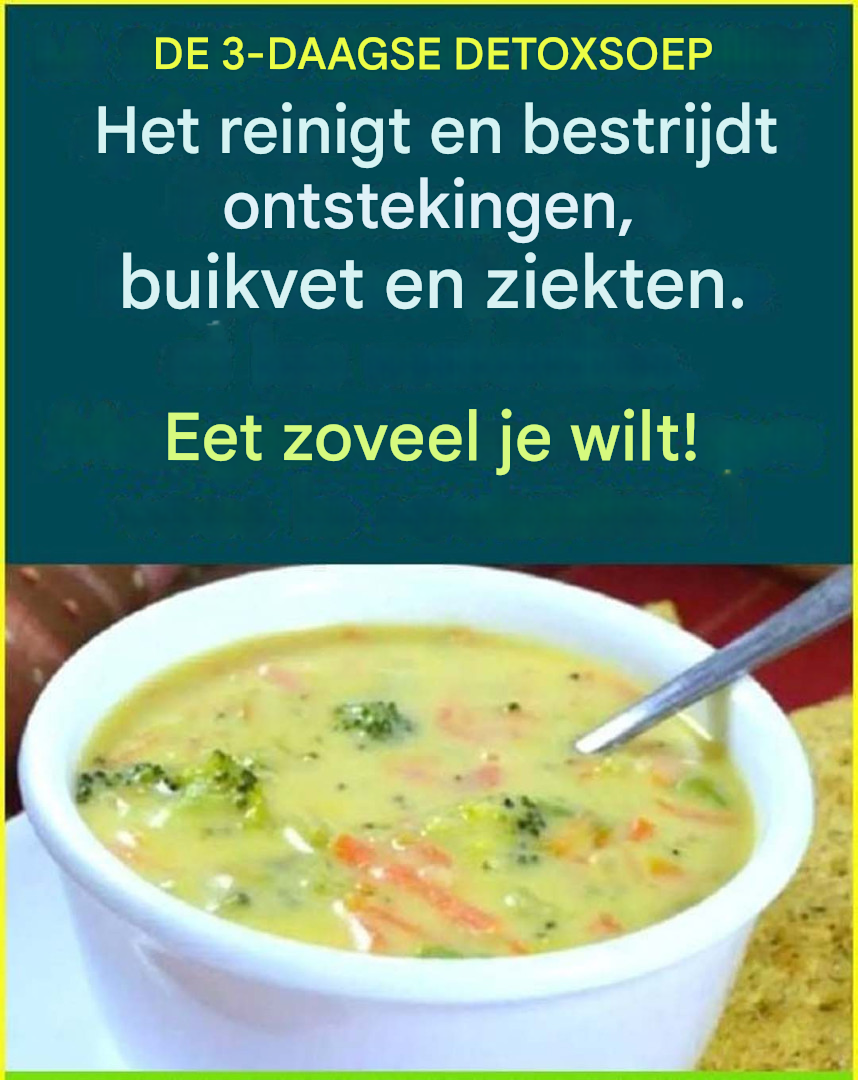 Het menselijk lichaam heeft zijn eigen afweermechanismen om gifstoffen af te voeren via de nieren, lever en het immuunsysteem. Onze levensstijl en de omgeving waarin we leven kunnen deze natuurlijke processen echter vertragen. Een detoxkuur kan dan uitkomst bieden om het lichaam een boost te geven. Hier is een 3-daagse detoxsoepkuur die helpt het lichaam te reinigen, ontstekingen te verminderen en buikvetverlies te bevorderen. 1. Wortel-gembersoep Ingrediënten: 6 kopjes botten- of groentebouillon 1 kg wortels, in plakjes 2 uien, geschild en gesnipperd 2 eetlepels kokosolie 3 eetlepels verse gember, geraspt 3 teentjes knoflook, fijngehakt Zeezout, zwarte peper en uienpoeder naar smaak Bereiding: Doe de wortels, knoflook, gember en bouillon in een grote pan. Breng aan de kook. Karamelliseer ondertussen de uien in een andere pan met kokosolie tot ze goudbruin zijn. Voeg, zodra de wortels gaar zijn, de gekaramelliseerde uien toe en pureer alles tot een gladde, romige massa. 2. Ingrediënten voor broccolisoep: 2,5 kopjes broccoliroosjes 3 selderijstengels, in blokjes gesneden 2 wortels, geschild en fijngehakt 2 kopjes groente- of bottenbouillon 1 ui, in blokjes gesneden 1 kopje boerenkool of spinazie Sap van een halve citroen 2 eetlepels kokosolie 1/2 theelepel zeezout