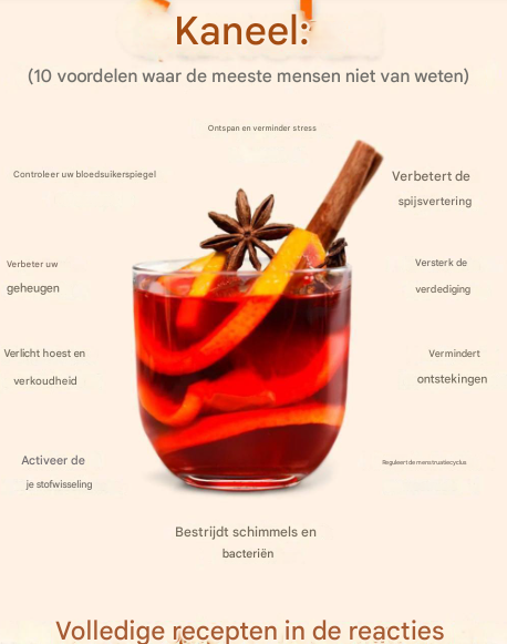 Kaneelthee (½ kopje gemalen kaneel in een kopje heet water). Drink dit twee keer per week op een lege maag.
