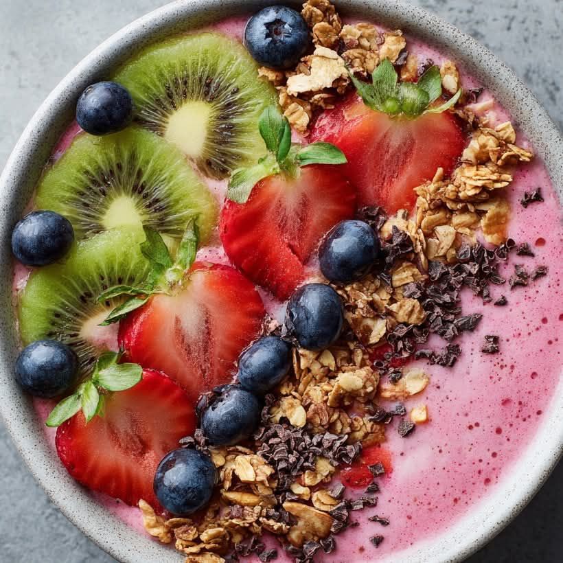 Ingrediënten: Smoothiebodem: 1 kopje bevroren gemengde bessen (aardbeien, frambozen, bosbessen) 1 bevroren banaan 🍌 1/2 kopje Griekse yoghurt (of plantaardige yoghurt) 1/2 kopje amandelmelk (of andere melk) 1 theelepel honing of ahornsiroop (optioneel) Toppings: 3-4 verse aardbeien, in stukjes 🍓 1/2 kiwi, in stukjes 🥝   1 handvol verse bosbessen 🫐 2 eetlepels granola 1 … Read more