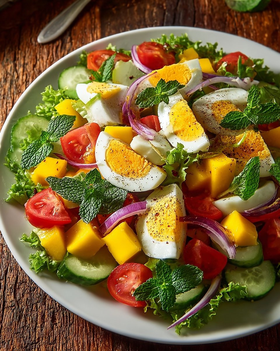 Ingrediënten: – 3 gekookte eieren – 1/2 kopje sla – 1/4 kopje komkommerschijfjes – 1/4 kopje tomatenschijfjes – 1/4 kopje mangoblokjes – 1/4 kopje rode uischijfjes – Verse muntblaadjes – Zwarte peper – Zout Bereidingswijze: