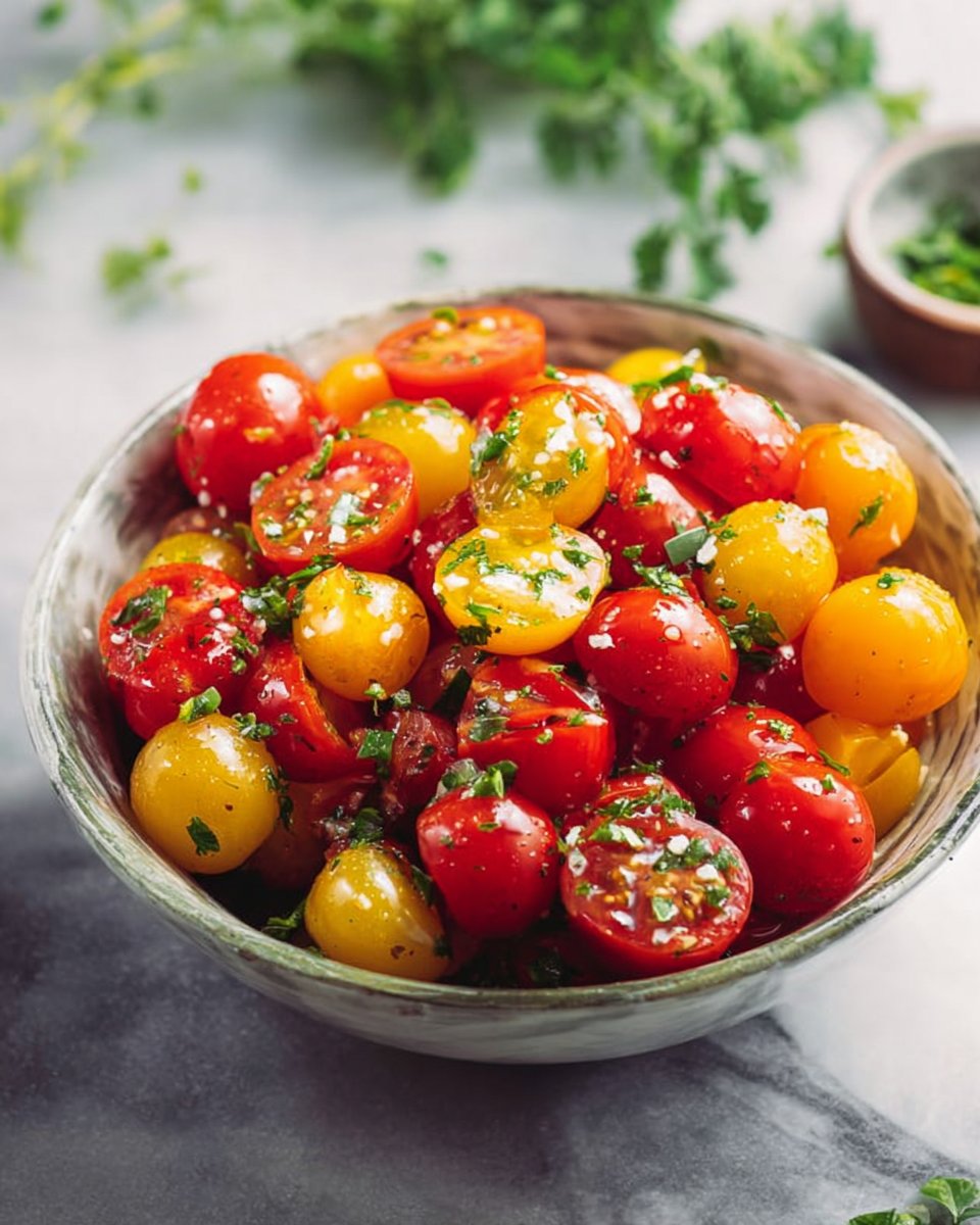 Ingrediënten: – 60 ml extra vierge olijfolie – 3 eetlepels rodewijnazijn – 1/2 theelepel zout – 1/2 theelepel suiker – 2 eetlepels fijngehakte kruiden – 1 liter cherrytomaatjes of kerstomaatjes (gehalveerd) Bereidingswijze: