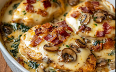 Kip gesmoord in een romige spinaziesaus met spek en champignons.