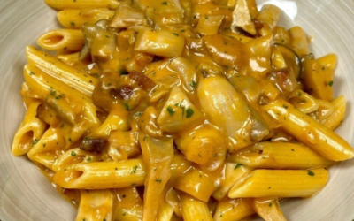 Ingrediënten (voor 4 personen) 350 g korte pasta (penne, rigatoni, caserecce) 200 g verse eekhoorntjesbrood (of champignons) 100 g spek…