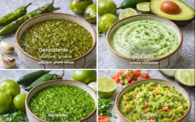 Salsa van geroosterde groene chilipepers Ingrediënten: 4 geroosterde groene chilipepers, 1 geroosterd teentje knoflook, 3 geroosterde tomatillo's, zout naar smaak…