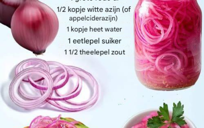 Ingrediënten:1 grote rode ui , in dunne plakjes gesneden1/2 kopje appelciderazijn1/2 kopje water 1eetlepel kristalsuiker1 1/2 theelepel zoutOptionele toevoegingen: 1 teentje knoflook (geplet), 1/2…