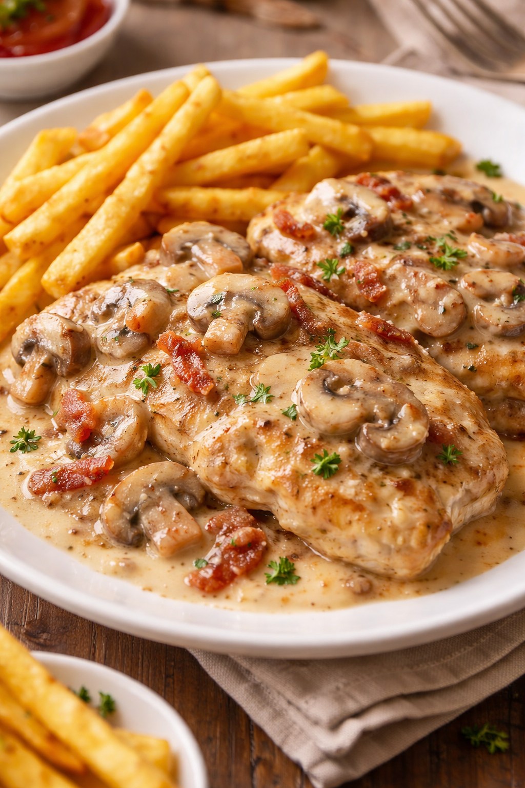 Deze varkensfilets in roomsaus met ham en champignons zijn pure comfortfood.