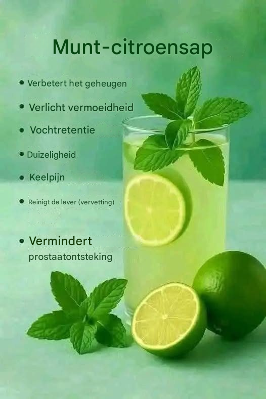 Munt-citroensap is een heldere, verkoelende drank met een verfrissende kruidige citrussmaak. De munt zorgt voor een verkoelend gevoel en bevordert de spijsvertering, terwijl de citroen een pittige, vitaminerijke boost geeft. Het is heerlijk op warme dagen, na het sporten of bij de maaltijd.